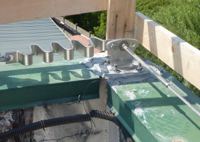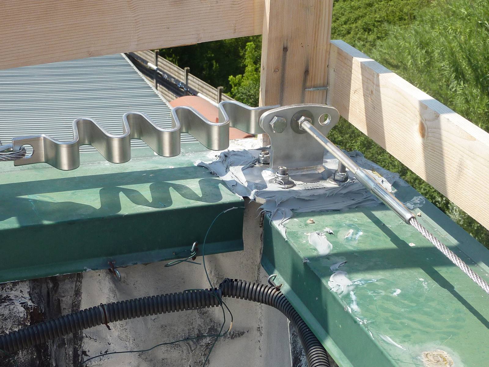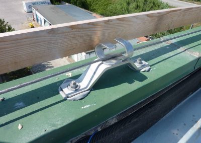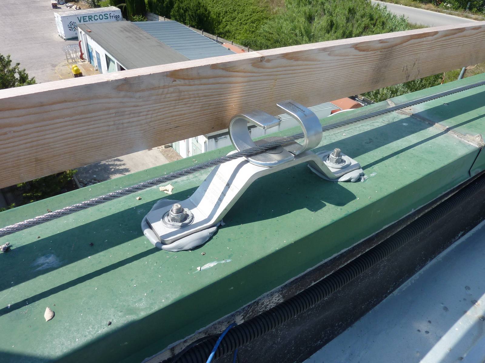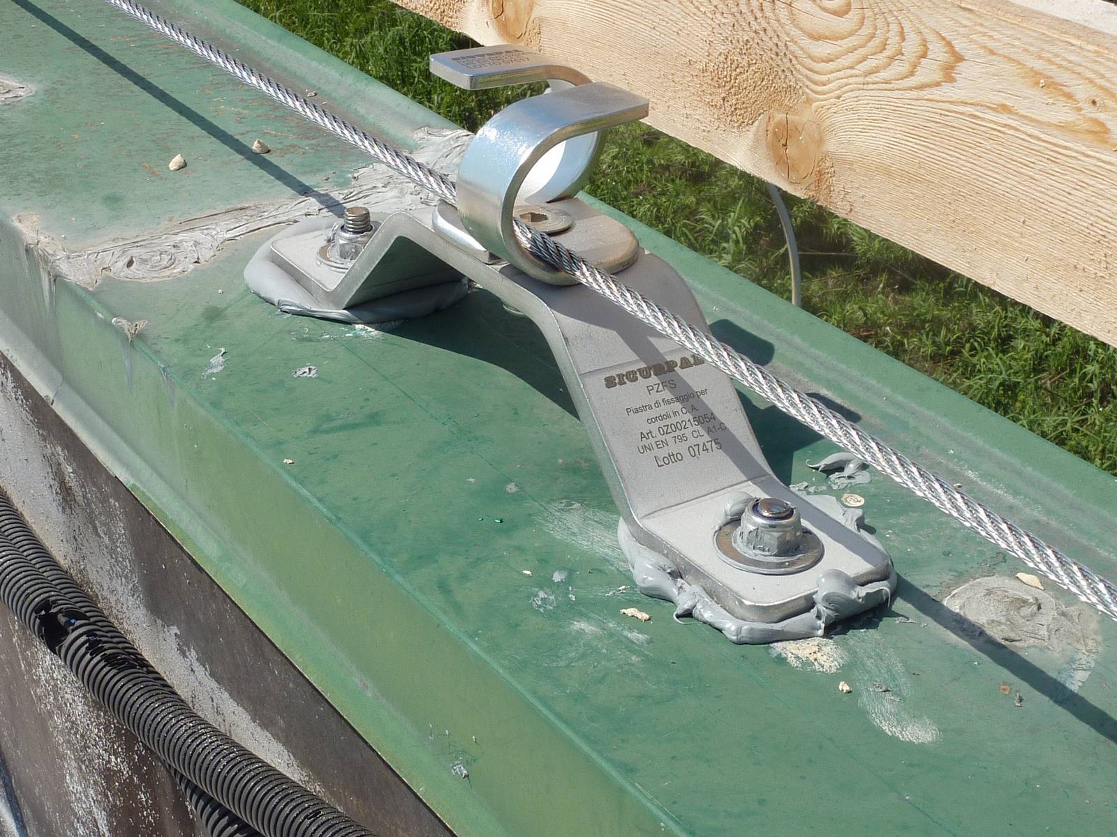 L’impianto è costituito da quattro linee vita di classe C UNI EN 795 posizionate sul cordolo perimetrale in c.a. con piastre in acciaio inox SZP fissate con barre filettate e resine bicomponenti. L’accesso avviene in sicurezza avendo l’utilizzo della linea vita nelle immediate vicinanze, o grazie all’utilizzo di un punto individuale di ancoraggio di classe A.
